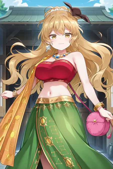 matara okina, 1girl, solo, yellow eyes, blonde hair, long hair, 波浪发, 胸部, matara okina (更衣室之神), 替代服装, 口红, 棕色帽子, 小帽子, 发圈, 白色发圈, 不匹配的耳环, 项链, 蓝色吊坠, 沙丽, 印度服饰, 太阳图案, 星座图案, 裸露肩膀, 红色背心, 无吊带, 露脐, 肚脐, 金色手镯, 绿色裙子, 金色镶边, 袋包,