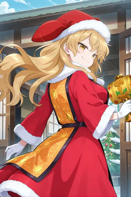 matara okina, 1girl, solo, yellow eyes, blonde hair, long hair, matara okina (从后门道晚安), 替代服装, 替代头饰, 红色帽子, 毛皮镶边头饰, 橙色罩衫, 太阳图案, 圣诞装, 红色连衣裙, 长袖, 毛皮镶边袖子, 白色手套, 手持袋子, 手持锤子, 奇迹锤子,
