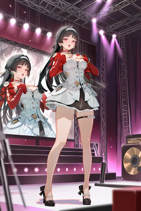她的吊灯服装附加提示:白色发带、耳环、可拆卸领子、颈部丝带、黑色无肩带连衣裙、大腿绑带、白色外搭(服装)、细带高跟鞋