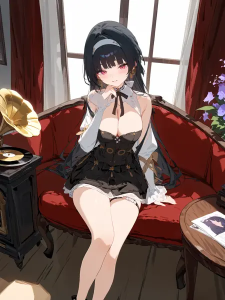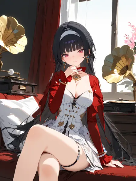 她的吊灯服装附加提示:白色发带、耳环、可拆卸领子、颈部丝带、黑色无肩带连衣裙、大腿绑带、白色外搭(服装)、细带高跟鞋