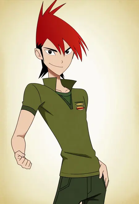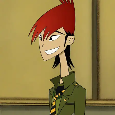대체 옷차림: 녹색 재킷, 검은 안티셔츠, 녹색 폴로 셔츠, 노랑과 검은 넥타이, 진한 녹색 바지, 회색과 주황색 스니커즈