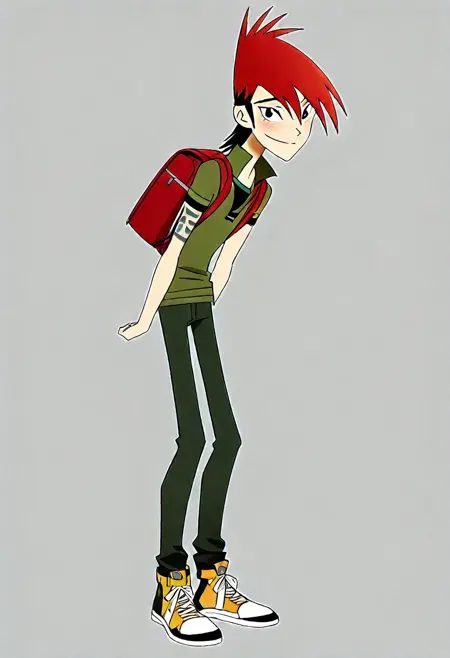 기본 복장: 녹색 폴로 셔츠, 진한 녹색 바지, 회색 및 주황색 스니커즈