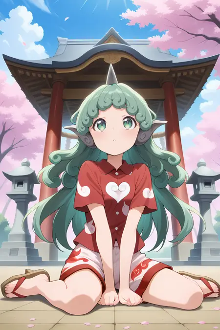 komano aunn, 1girl, solo, green eyes, green hair, long hair, curly hair, komainu ears, single horn, komainu tail, green tail,