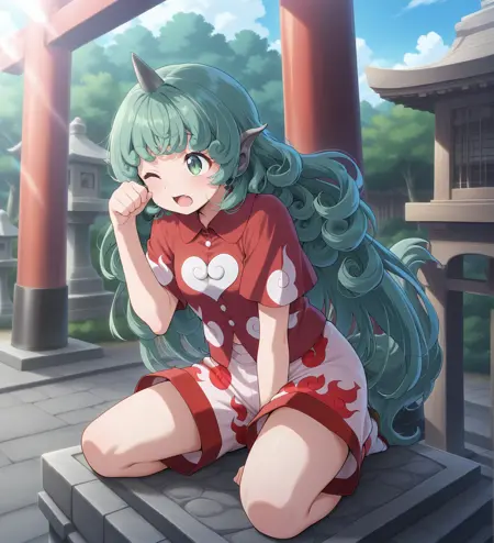 komano aunn, 1girl, solo, green eyes, green hair, curly hair, komainu ears, long hair, single horn, tail, fang,