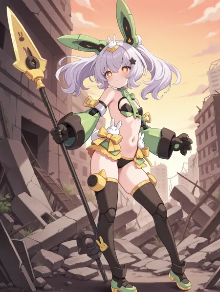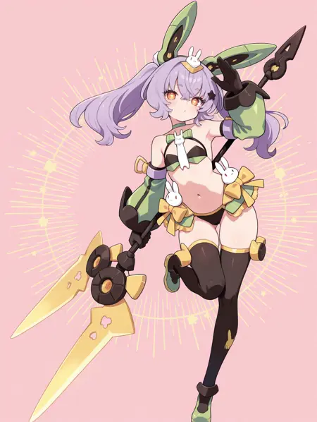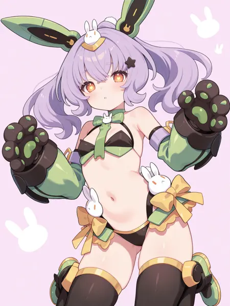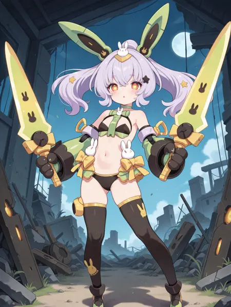 태그(옷 1): 노란색 리본, 검은색 속옷, 녹색 부츠, 녹색 분리형 소매, 검은색 기계식 발톱 장갑, 녹색 기계 토끼 귀, 녹색 브라, 토끼 넥타이, 토끼 머리 장식, 노란색 허벅지 끈, 별 모양 머리 장식, 녹색 목걸이