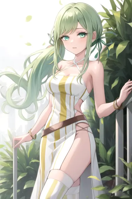 | 训练词汇 | AirontheG, 1girl, solo, long hair, aqua eyes, thighhighs, white dress, green ribbon, bare shoulders, jewelry, green eyes, collarbone, hair ribbon, ponytail, sidelocks, medium breasts, green hair, sleeveless, belt, bracelet, swept bangs, halterneck, side slit, long dress, striped dress, single sleeve, vertical-striped dress已复制! |