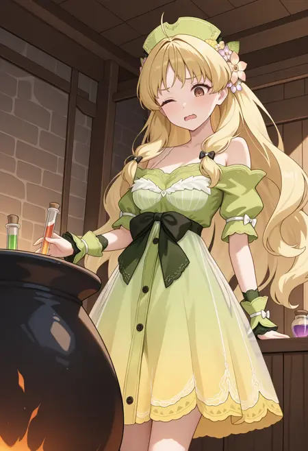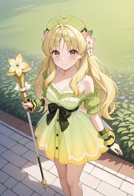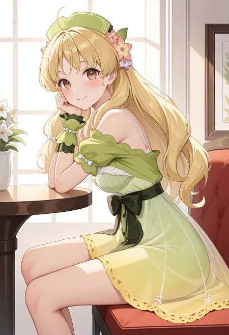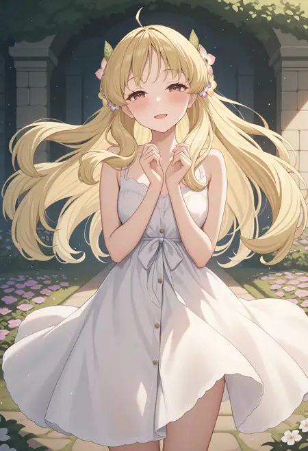 • aaayesha, blonde hair, brown eyes, long hair, hair flower, ahoge,