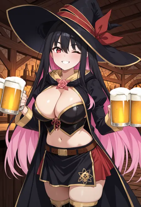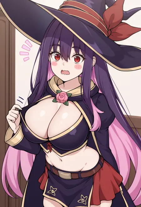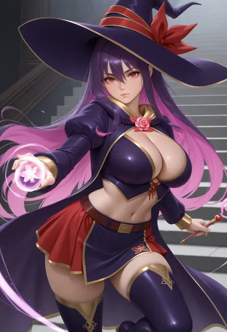 id0l4, 보라색 머리카락, 색상 내부 머리카락, 분홍색 머리카락, 긴 머리카락, 눈 사이의 머리카락, 마녀 모자, 보라색 머리 장식, 모자 리본, 빨간 눈, 큰 가슴, 보라색 망토, 꽃 브로치, 줄리엣 소매, 크랍 탑, 가슴 노출, 허리 노출, 이톤 스커트, 보라색 스커트, 빨간 스커트, 갈색 벨트, 허벅지 부츠, 보라색 신발