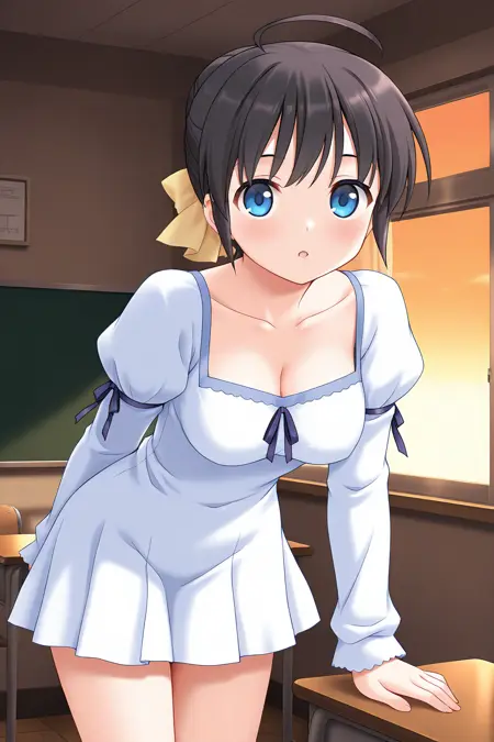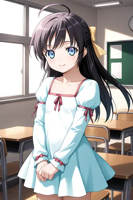 **变身前:**kunugi yuuna,blue eyes,black hair,long hair,half updo,bow,hair bow,yellow bow,flat chest,