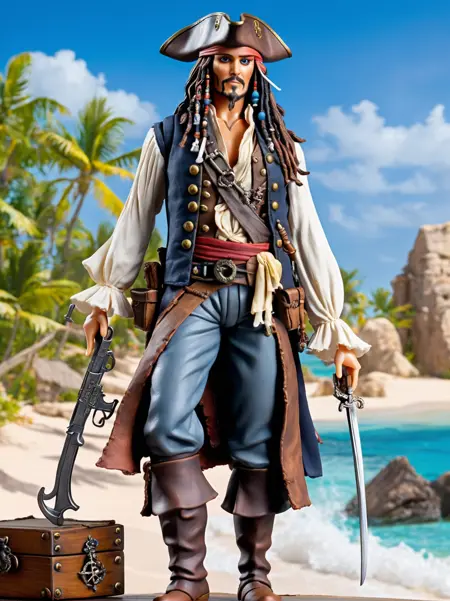 (premium playset toy box)、(繊細)、(masterpiece, best quality, ultra detailed, absurdres)、(アクションフィギュアボックス)、(inboxDollPlaySetQuiron style)、(キャプテン・ジャック・スパロウ (パイレーツ・オブ・カリビアン):ジャック・スパロウの絡まった髪、ボロボロの海賊服、魅力的な立ち振る舞いは、楽しくて認識しやすいコスプレの選択肢です。:1.2)、(toy playset pack)、lyco:SDXL1.0_quiron_inboxDollPlaySet_v5.1_lycoris:0.97