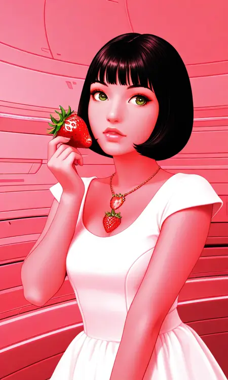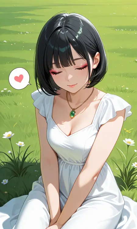 1woman,medium hair,bob cut,black hair,green eyes,white dress,necklace