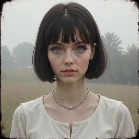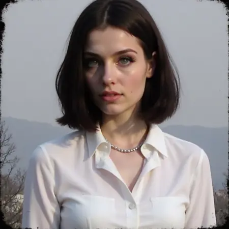 1woman,medium hair,bob cut,black hair,green eyes,white dress,necklace