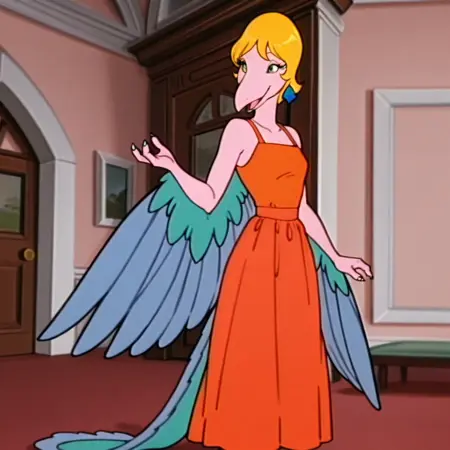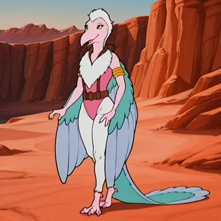 TeryxDSilv2, anthro, female, Archaeopteryx, pink skin, green eyes, white hair, winged arms, long bird tail, pink talons