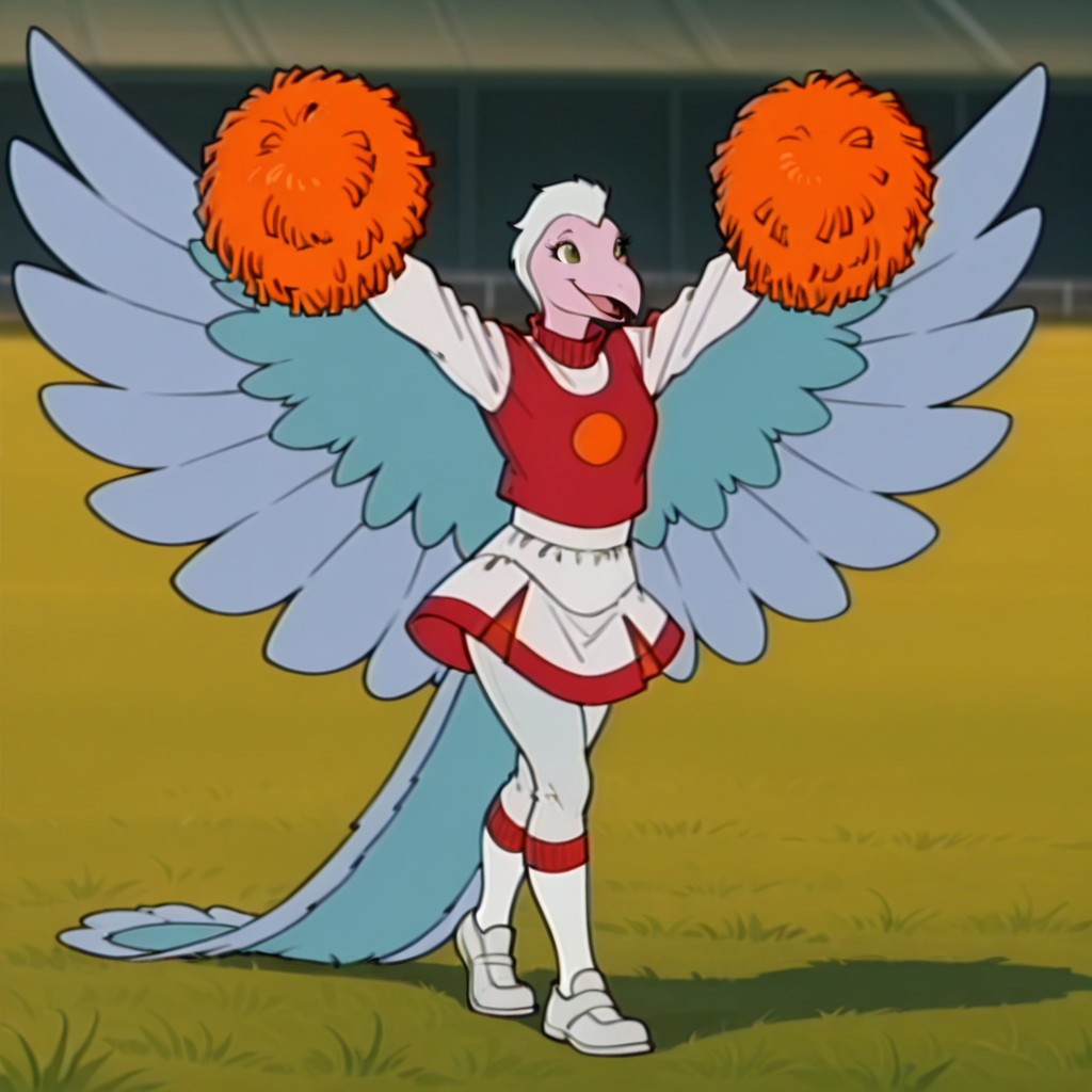 red shirt, long sleeves, white sleeves, white skirt red trim, white Faux Fur pants, calf-length white sock with red trimmed, white shoes, holding orange pom poms