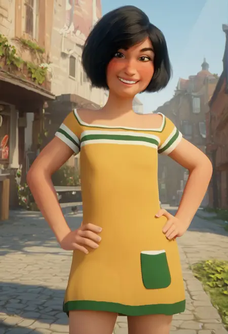 mariolina_yellow_rtzbb, 1girl, tanned skin, short black hair, thick eyebrows, dark green eyes, freckles, small yellow dress with with green and white strides (green pocket on the right bottom side of her dress), short sleeves, long white socks, red sneakers with white laces,