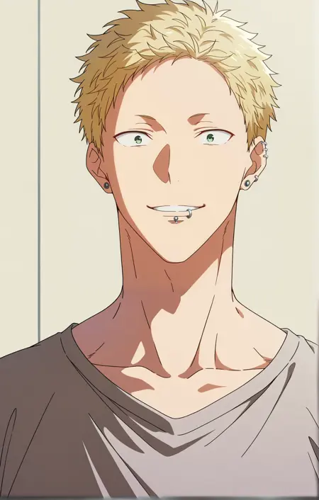 kaji, akihiko_kaji, blonde hair, short hair, green eyes, constricted pupils, ear piercing, lip piercing,