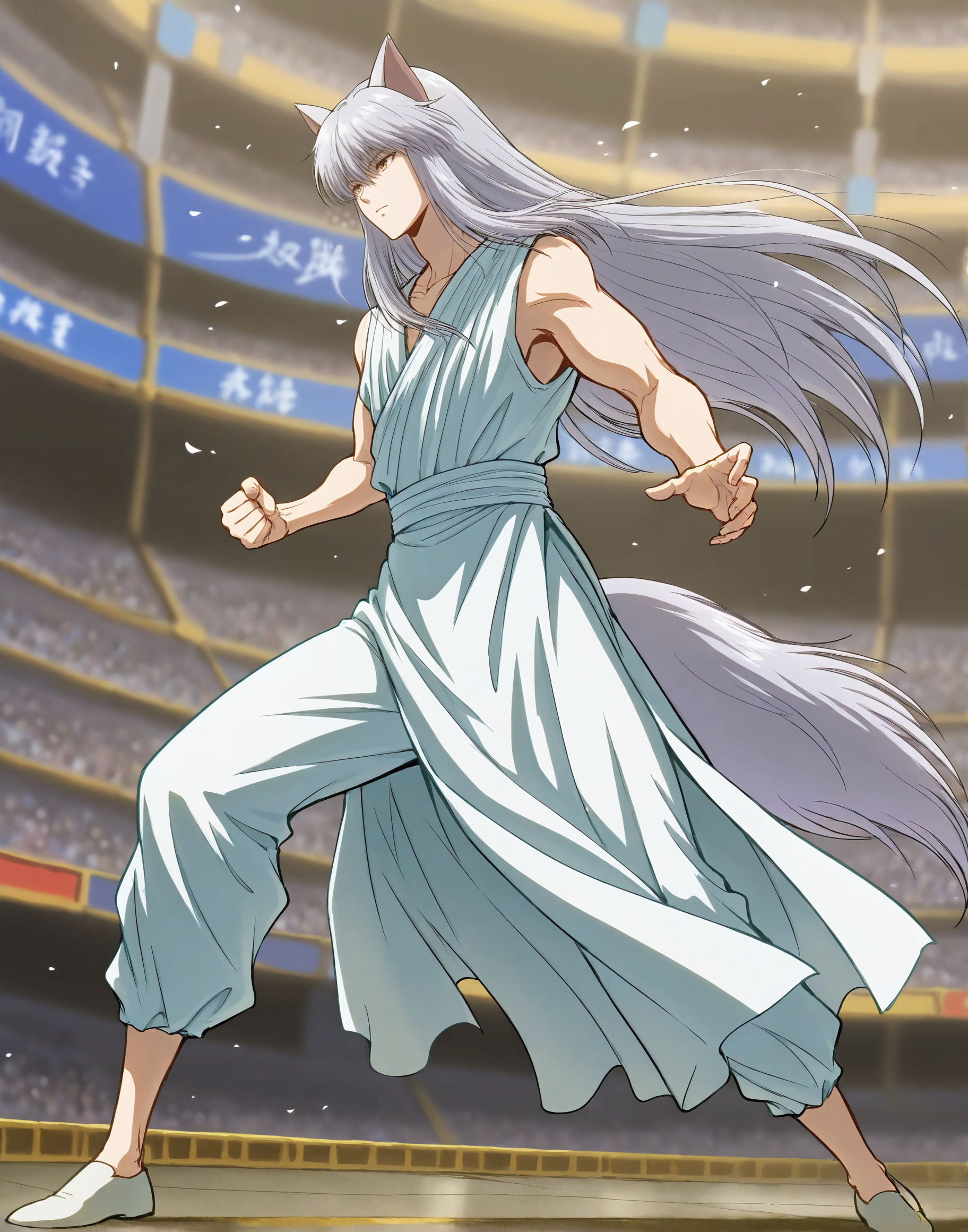 | 训练词汇 | retro artstyle,1990s \(style\)已复制! youko01, long hair, tail, muscular, grey hair, fox ears, fox tail, sleeveless,fox tail, pants, white pants, very long hair, robe, sash, japanese clothes, brown eyes, baggy pants, sidelocks, white shirt, white footwear,已复制! |