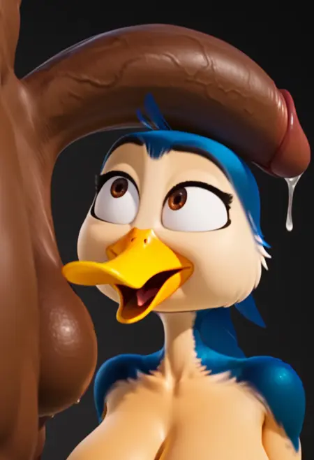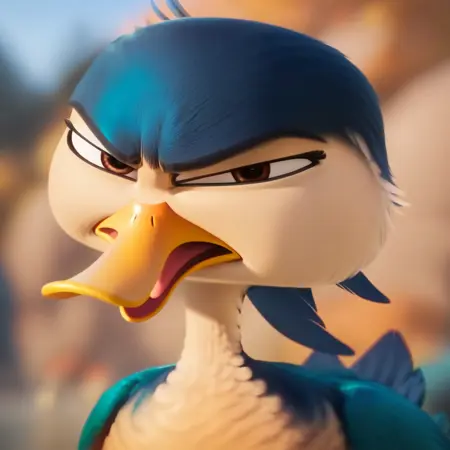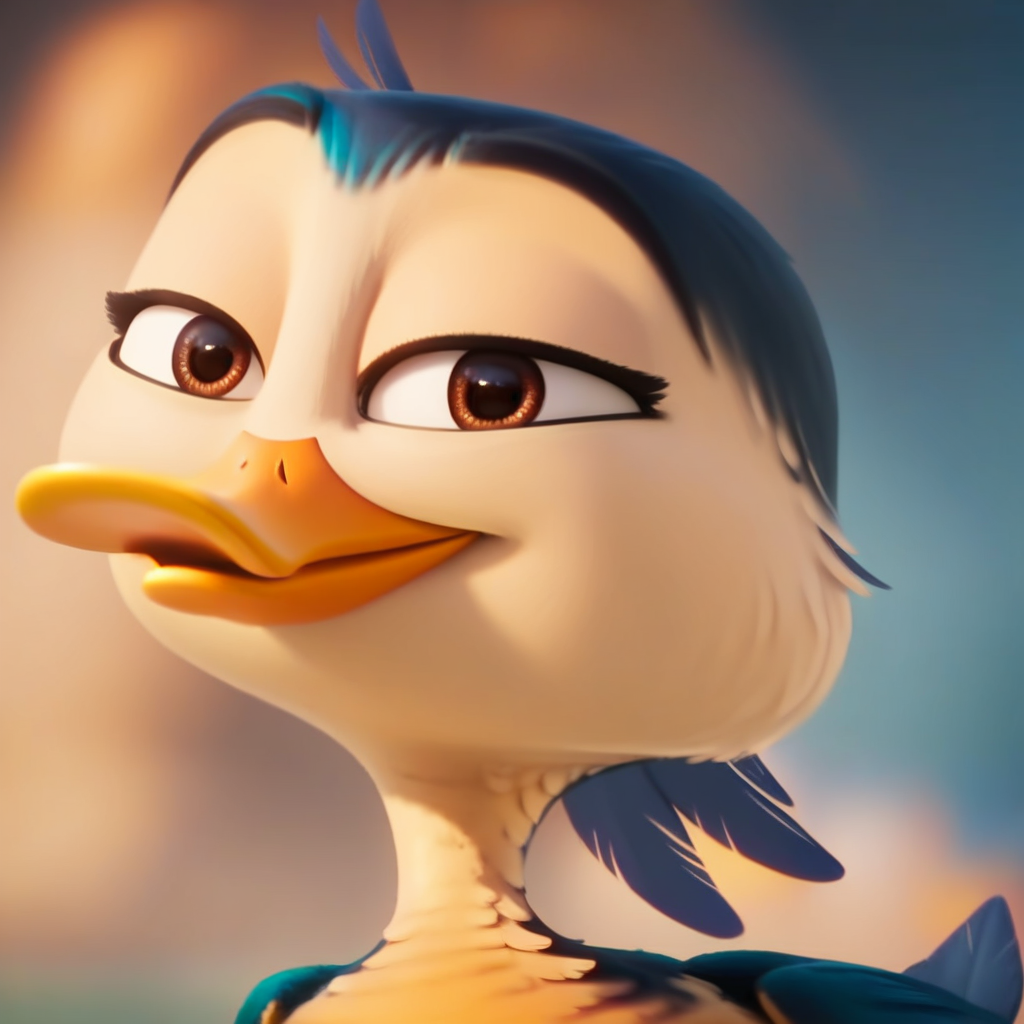 긍정적 프롬프트: KimMG, 퓨리, 페럴, 퓨리 여성, 조류, 오리, 갈색 눈, 검은 동공, 노란 부리, 파란 몸, 흰 몸, 깃털, 깃털 꼬리, 막발, 깃털 달린 팔