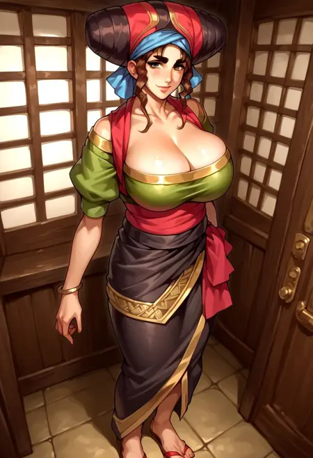 big body, huge breasts, thick thighs, brown wavy hair, brown eyes, thick eyebrows, yellowish green bustier, red obi, black skirt, blue bandanna, black and red hat, sandals, gold bracelet, cleavage,