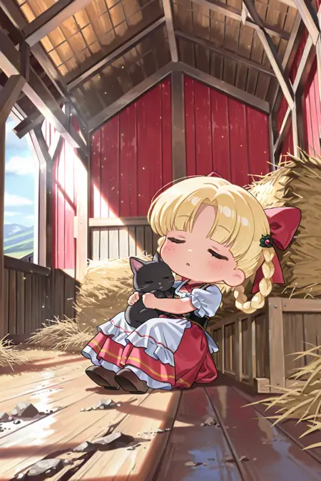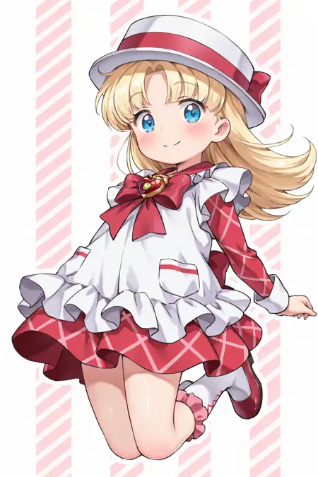 포크피 해트, 빨간 모자 리본, 금발 머리, 긴 머리, 돌려진 머리, 중간 갈라진 앞머리, 파란 눈, 드레스, 빨간 드레스, 에프론, 흰 에프론, 프릴이 있는 에프론, 긴 소매, 아르글레이, 손목 커프, 브로치, 하트 브로치, 가슴 리본, 뒤쪽 리본, 프릴, 우산, 파라솔, 양말, 신발, 리본, 춤추기, 회전, 우산 들고 있음