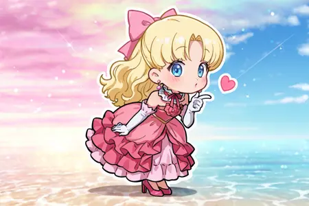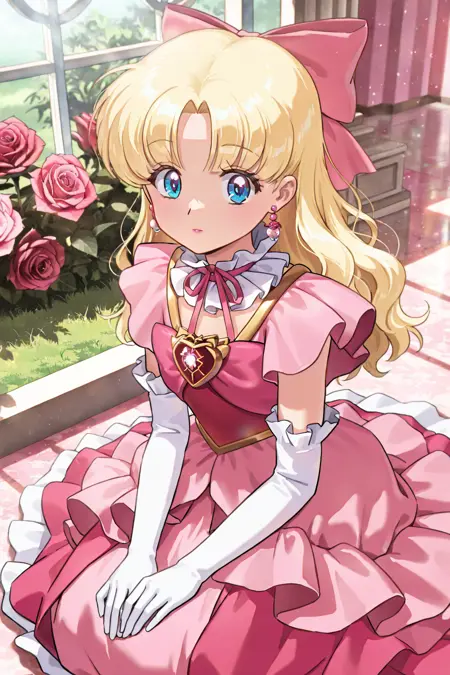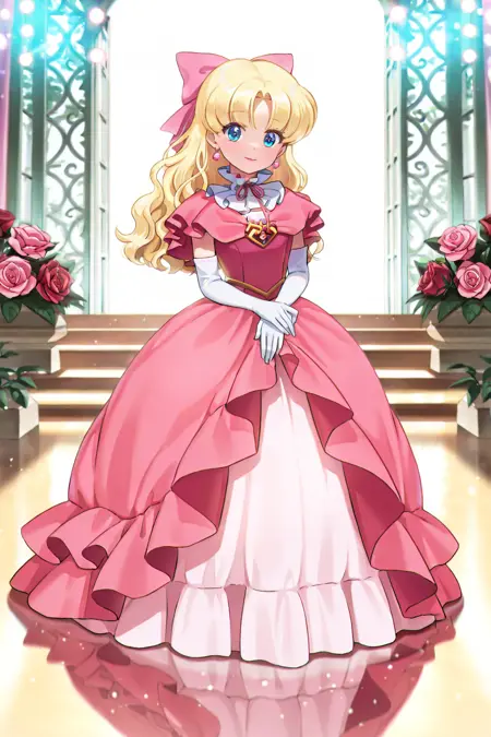 긴 드레스, 분홍 드레스, 프릴 칼라, 리본, 프릴 드레스, 층층이 된 드레스, 프릴, 분홍 리본, 긴 머리, 물결 모양 머리, 중간 갈라진 앞머리, 머리 리본, 흰 장갑, 팔꿈치 장갑, 보석, 귀걸이, 하이힐, 분홍 하이힐, 분홍 장미, 볼룸, 앉아 있음, 세이자, 무릎 꿇음, 플랫폼, 플랫폼 위