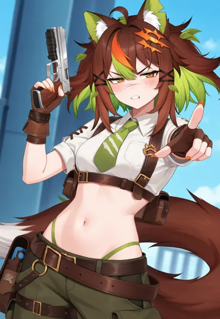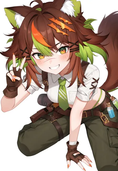 | 학습된 단어 | 1girl, furi ferntail, green eyes, brown hair, green hair, multicolored hair, colored inner hair, short hair, messy hair, hair ornament, animal ears, notched ear, freckles, scar on face,복사됨! medium breasts, white shirt, short sleeves, chest harness, green necktie,복사됨! navel, green pants, belt, panty straps,복사됨! fingerless gloves, orange nails, long fingernails,복사됨! |