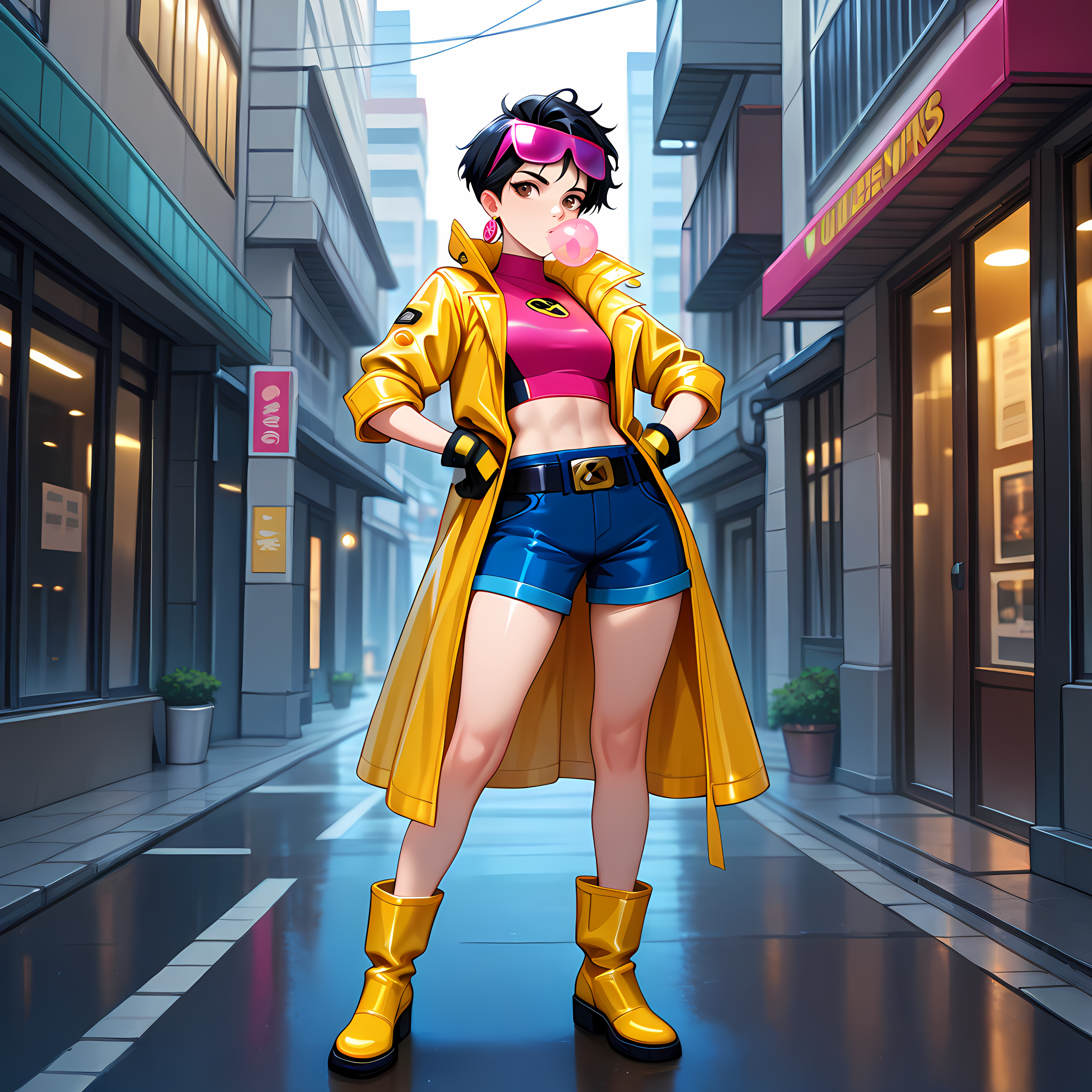 オプション:黒髪、短髪、茶色の目、ジュエリー、サングラスを頭に、イヤリング、開いたコート、開いた服、黄色いジャケット、クロップドトップ、ベルト、青いショートパンツ、ブーツ、手袋