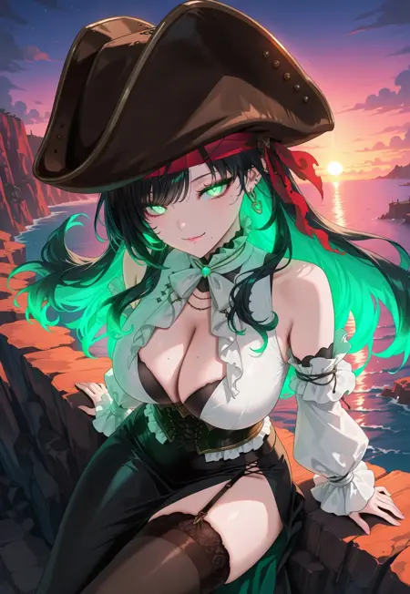 cersea soulstorm, long hair, black hair, colored inner hair, green eyes, large breasts, mole, pirate hat, red headband, bowtie, white shirt, detached sleeves, corset, cleavage, black skirt, side slit, thighhighs, garter straps, earrings,