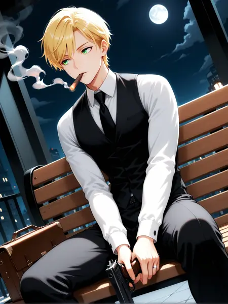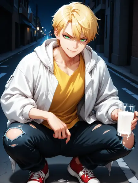Felix 프롬프트: 1boy, male, blonde hair, green eyes, short hair, swept bangs