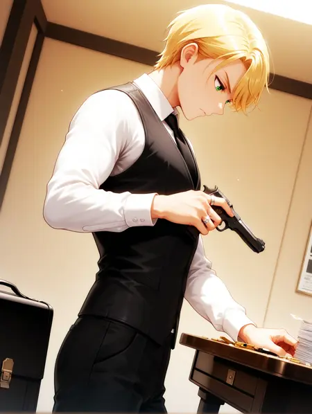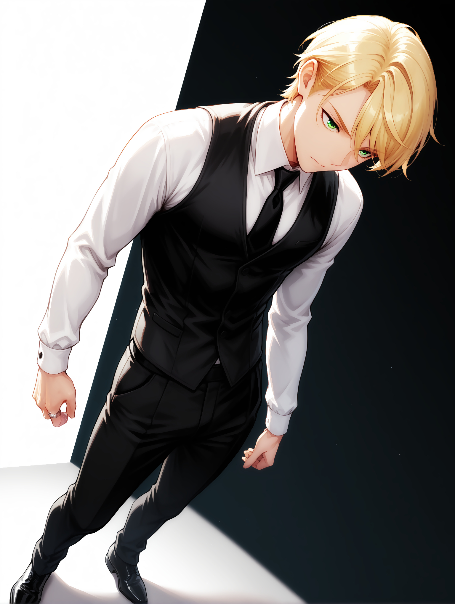 복장 프롬프트: vest, black vest, white collared shirt, necktie, long sleeves, black pants, formal, ring