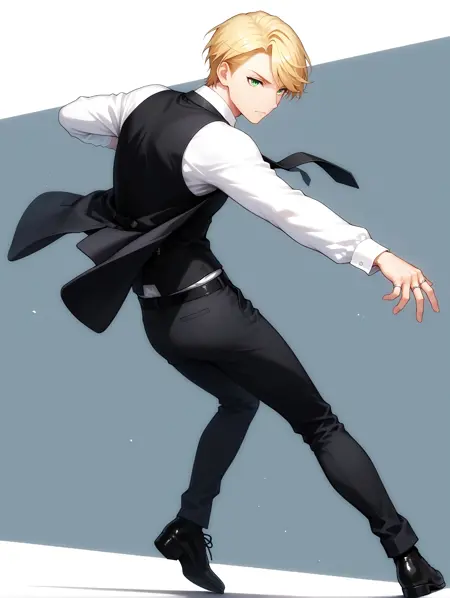그의 복장을 뒤에서 생성하려면 "pants" 프롬프트를 제거하세요. 그렇지 않으면 긴 재킷이 제대로 생성되지 않습니다.