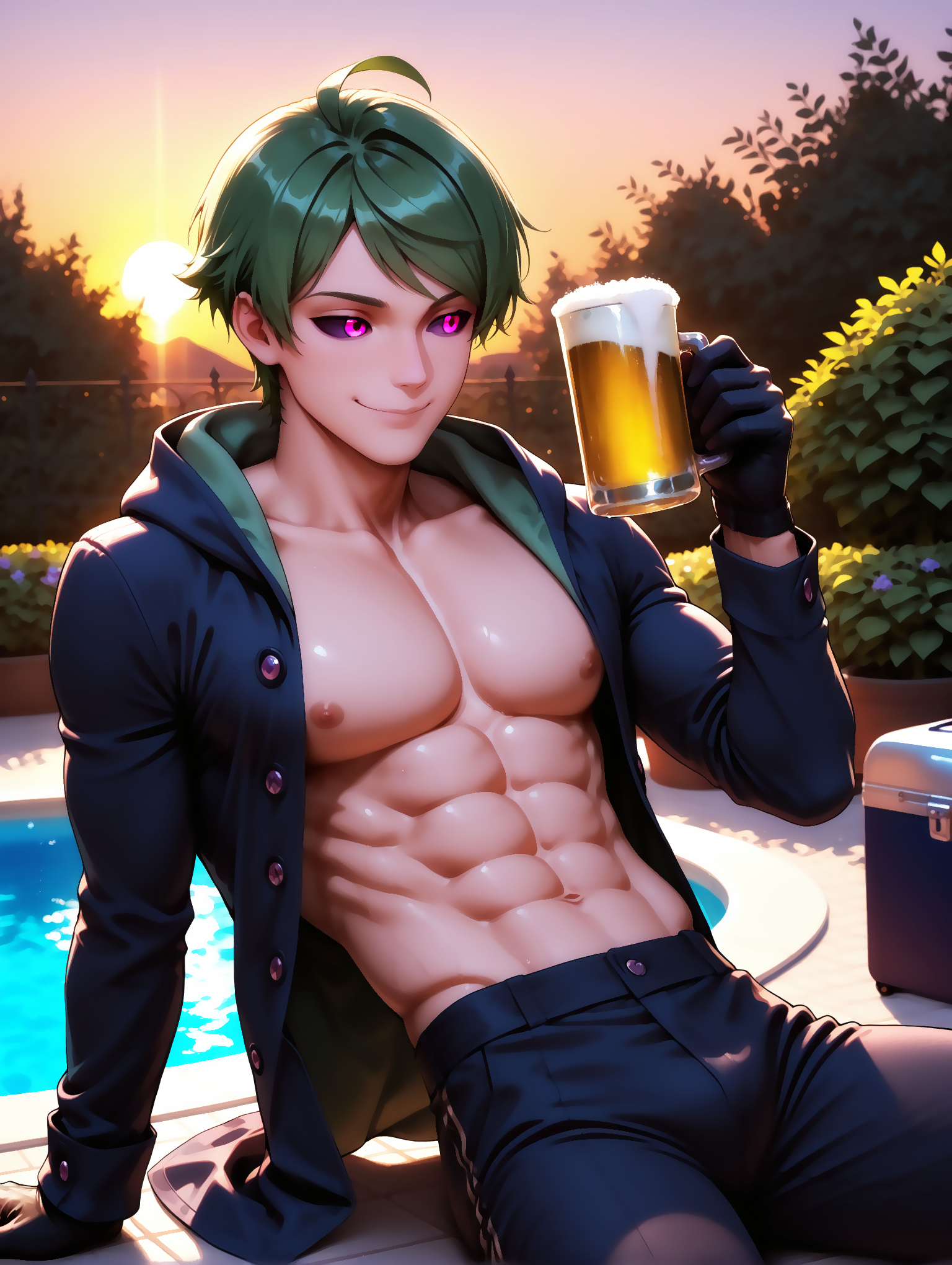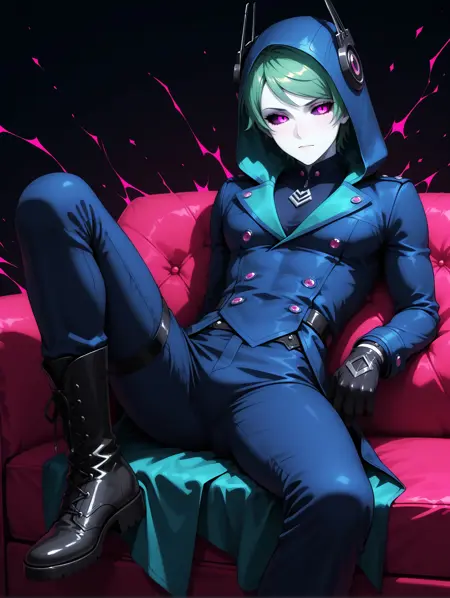 Argos Prompts : 1boy, male, green hair, colored skin, short hair, colored sclera, pink eyes, purple eyes, swept bangs