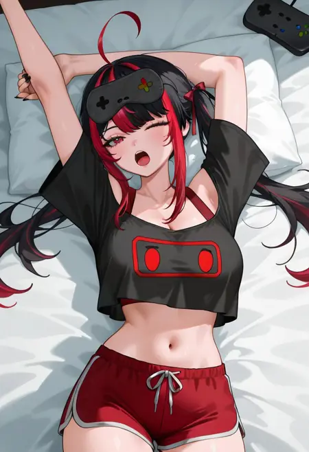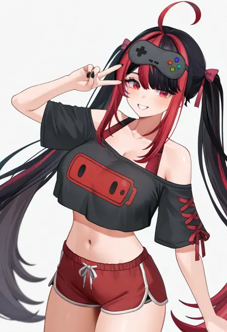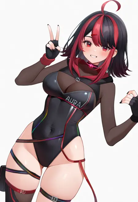 | 训练词汇 | gxaura, 1girl, medium hair, black hair, red hair, streaked hair, ahoge, red eyes, large breasts, leotard, black bodysuit, hood down, fingerless gloves, single thighhigh, thigh strap, hairclip, black nails, rainbow gradient,已复制! gxaura, 1girl, twintails, black hair, red hair, streaked hair, ahoge, red eyes, large breasts, black crop top, off-shoulder shirt, print shirt, crop top overhang, dolphin shorts, red shorts, red bra, bra strap, hair ribbon, black nails, sleep mask, controller,已复制! |