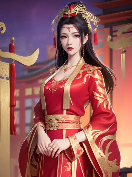 - 1girl,mature female,cityscape,night,looking at viewer,long hair,jewelry,hair ornament,earrings,red dress,chinese clothes,necklace,wide sleeves,sash,forehead jewel,cowboy shot,