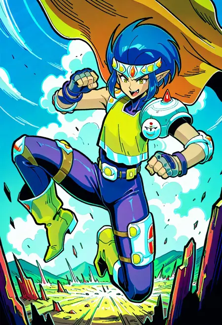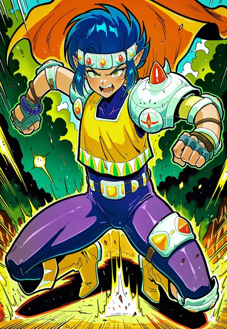 1boy, blue hair, jeweled headband, orange cape, single pauldron, loose yellow shirt, elbow pads, gray fingerless gloves, purple bracelets, sleeveless purple bodysuit, thigh armor, yellow boots, pointy ears