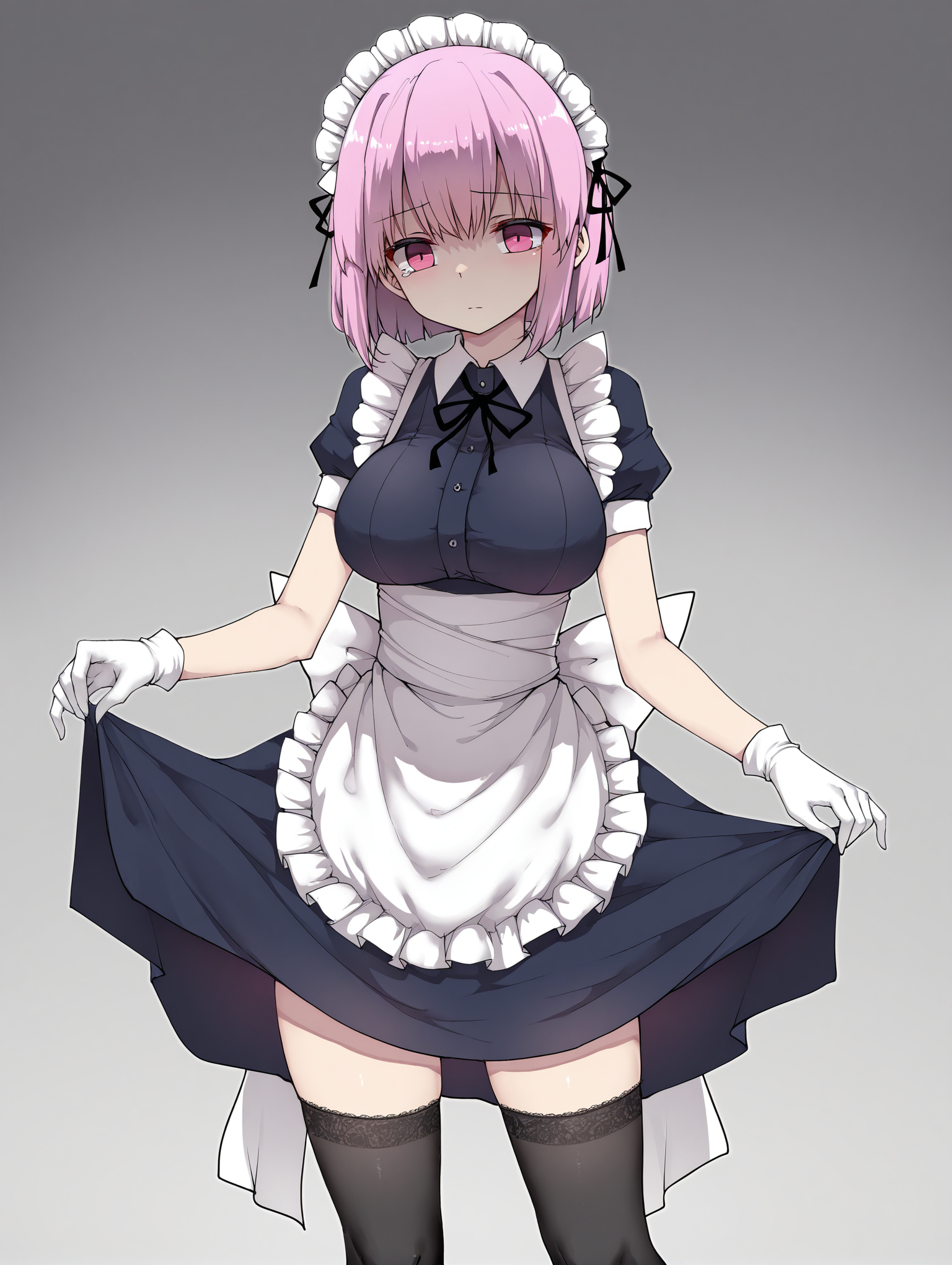 victoria453, 1girl, solo, red eyes, pink hair, hips, breasts, short hair, ribbon, apron, black ribbon, short sleeves, gloves, white gloves, thighhighs, maid, maid headdress, pink eyes, black thighhighs, dress,