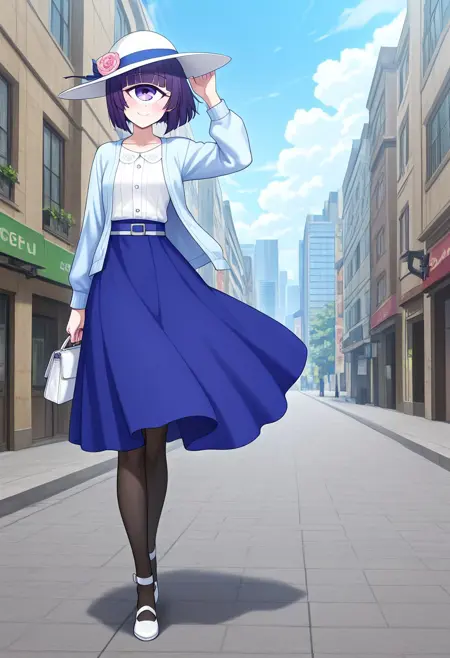 休闲装:蓝色短裙,蓝色夹克,白色衬衫,太阳帽,帽饰花,黑色丝袜,白色鞋子,手提包