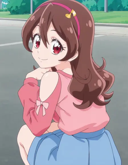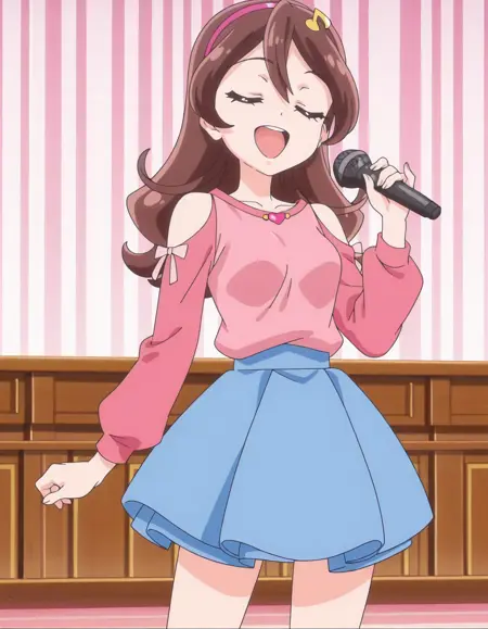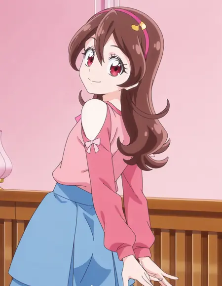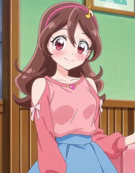 score_9, score_8_up, score_7_up, 动画截图, 单人, 1女孩, sakurauta, 蓝色裙子, 发带, 长袖, 心形, 肩部露空, 粉色衬衫, lora:sakurauta_pony:0.8