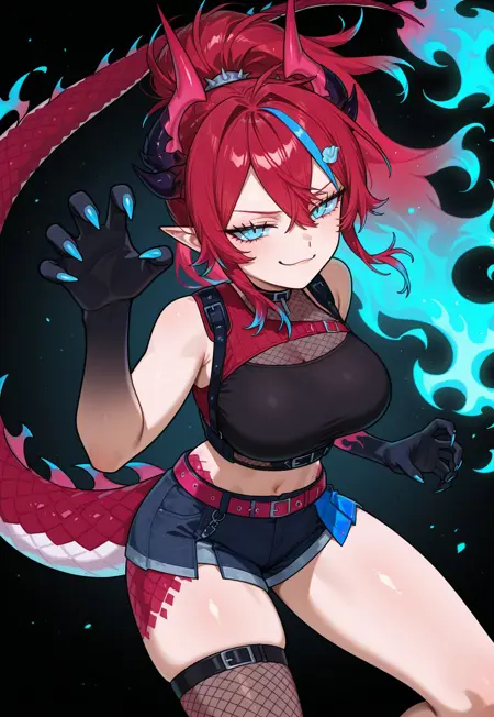 kai saikota, 1girl, red hair, streaked hair, ponytail, blue eyes, pointy ears, large breasts, black hands, claws, horns, dragon tail, fiery hair, shorts, crop top, fishnet top, single thighhigh, belt, blue fire, blue nails, bare arms,