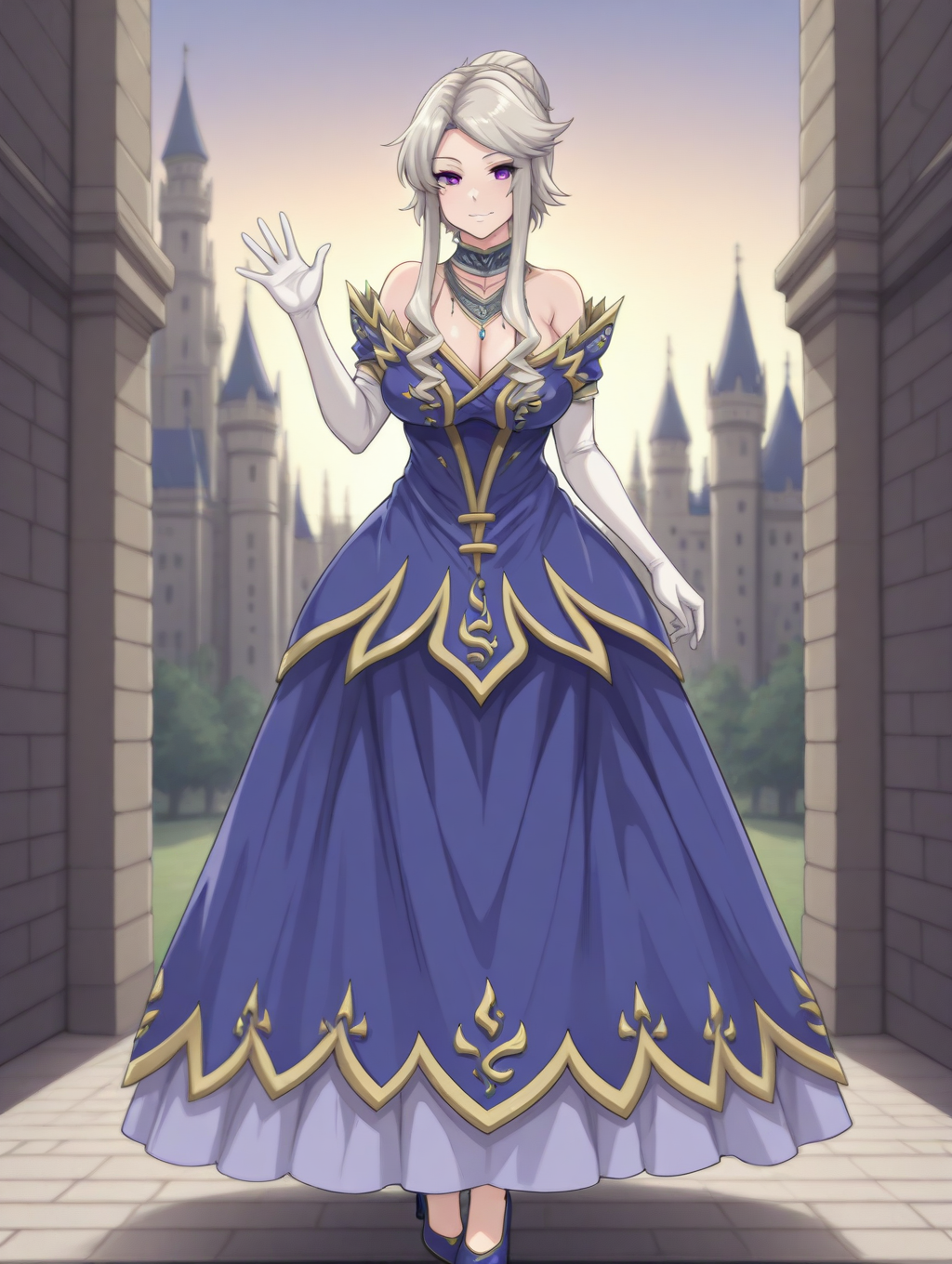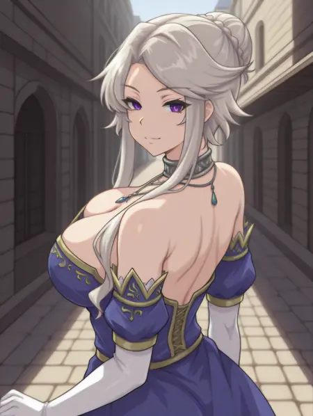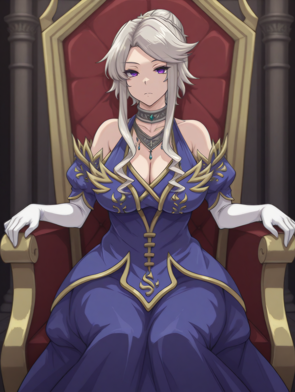 QueenGN、グレーの髪、長い髪と長い束、髪の結び目、側髪、パープルの目、大きな乳房、肘まである手袋、白い手袋、肩出し、ネックレス、青いドレス、青い取り外し可能な袖、胸元、