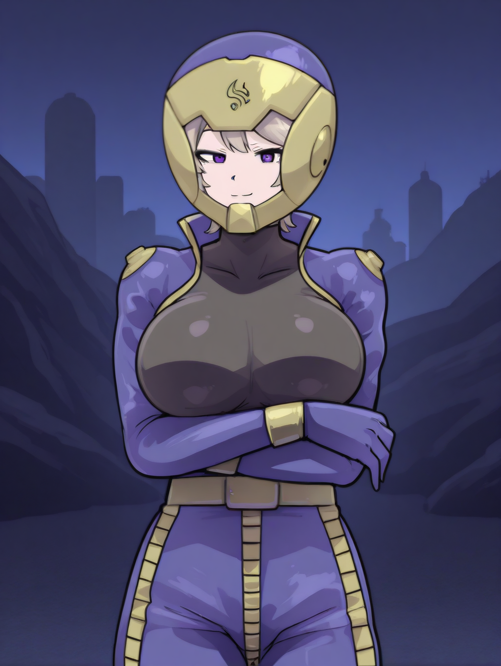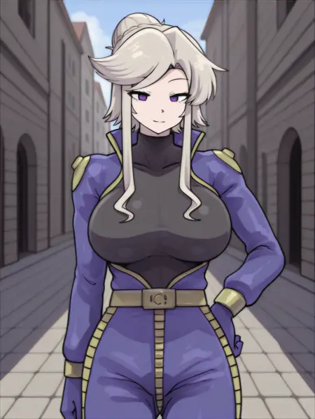 QueenGN、PilotQueen、グレーの髪、長い髪と長い束、髪の結び目、側髪、パープルの目、大きな乳房、青いボディスーツ、