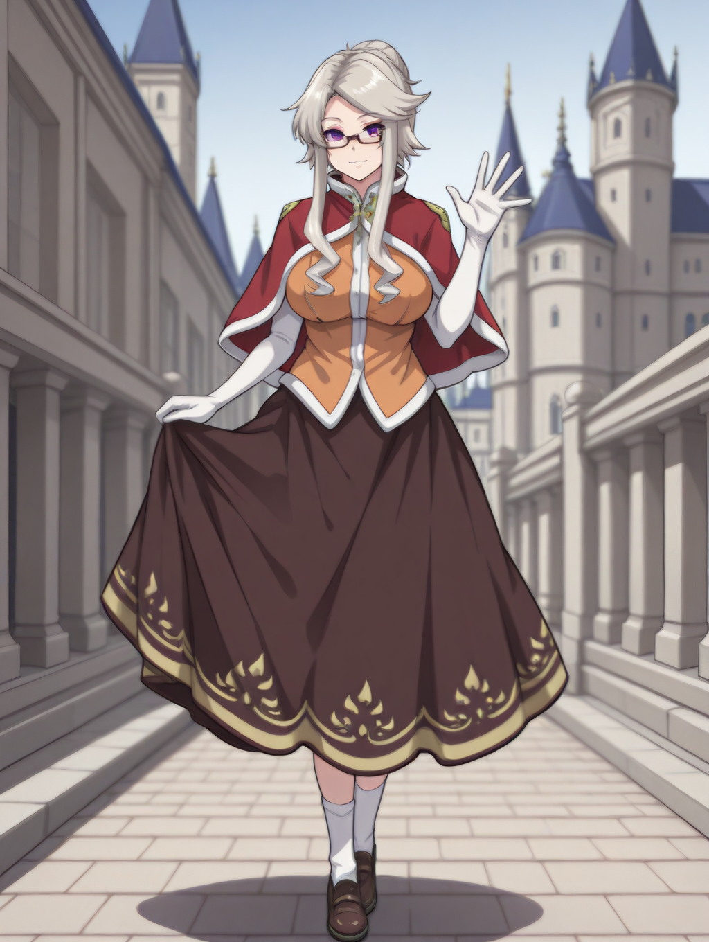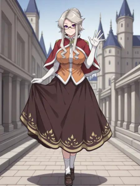 QueenGN、QueenMedal、グレーの髪、長い髪と長い束、髪の結び目、側髪、パープルの目、大きな乳房、眼鏡、赤いカプリーネ、肘まである手袋、白い手袋、オレンジのジャケット、茶色のロングスカート、
