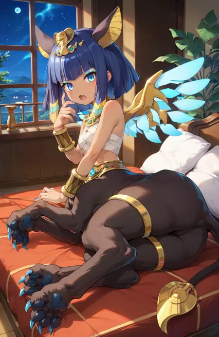 기본 프롬프트: meopatra, 1girl, 검은 피부를 가진 여자, 단발, 파란 머리, 파란 눈, 동물 귀, 두 꼬리, 메이크업, 아이섀도우, 붕대, 어깨 노출, 보석, 파란 날개, 송곳니, 몬스터 소녀, 이집트식, 토르, 파란 손톱