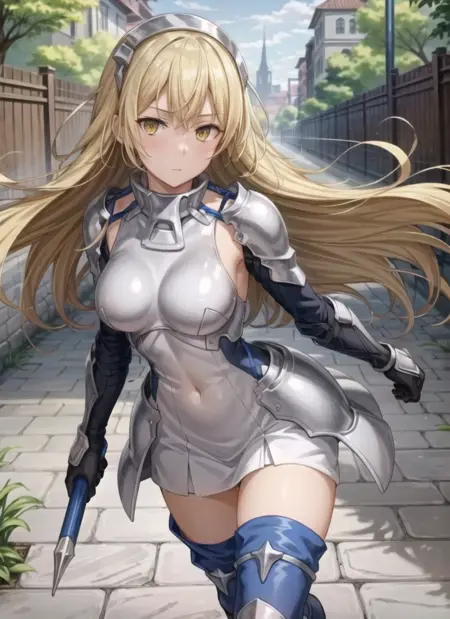 Recommended Prompts: ais, 1girl, solo, blonde hair, armor, long hair, straight hair, thighhighs, boots, dress, yellow eyes, thigh boots, blue long boots, blue footwear, covered navel, breastplate, shoulder armor, gloves, white dress