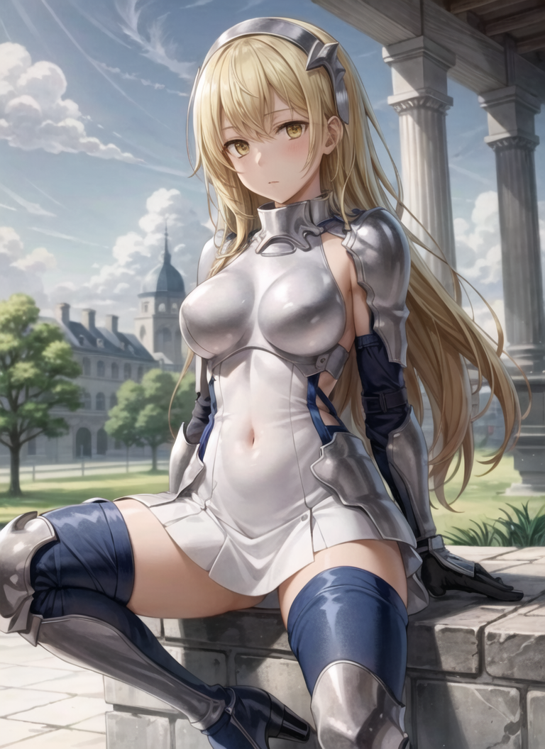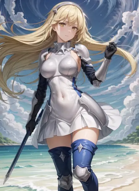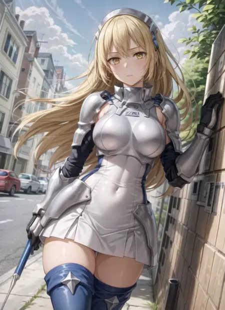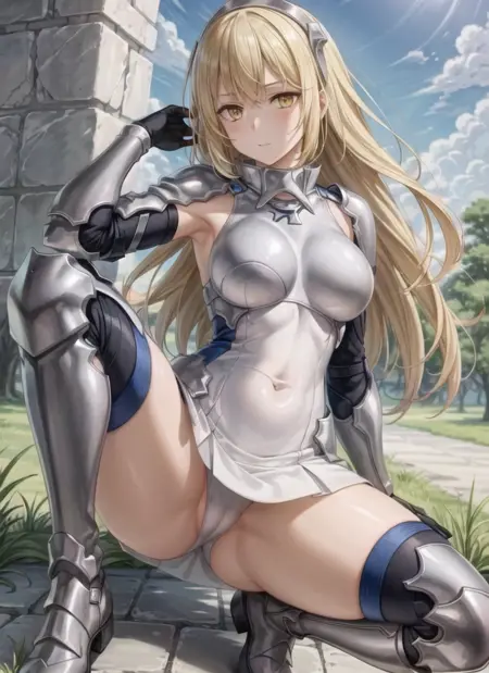 推荐提示:ais, 1girl, solo, blonde hair, armor, long hair, straight hair, thighhighs, boots, dress, yellow eyes, thigh boots, blue long boots, blue footwear, covered navel, breastplate, shoulder armor, gloves, white dress
