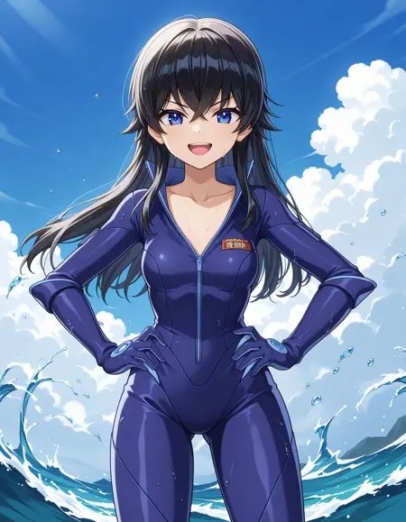 Otsuki_Uniform, blue bodysuit, elbow parts, collarbone, zipper