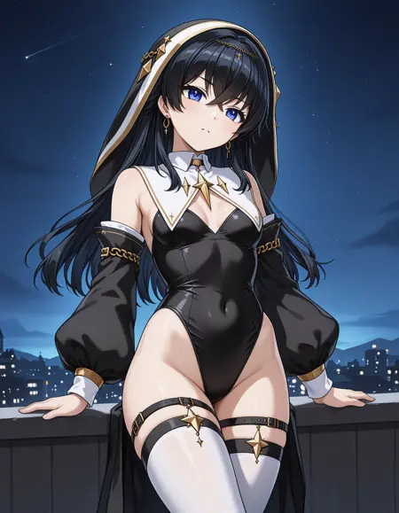 Otsuki_Nun, nun, gold earrings, detached sleeves, black leotard, highleg, white thighhighs, thigh strap