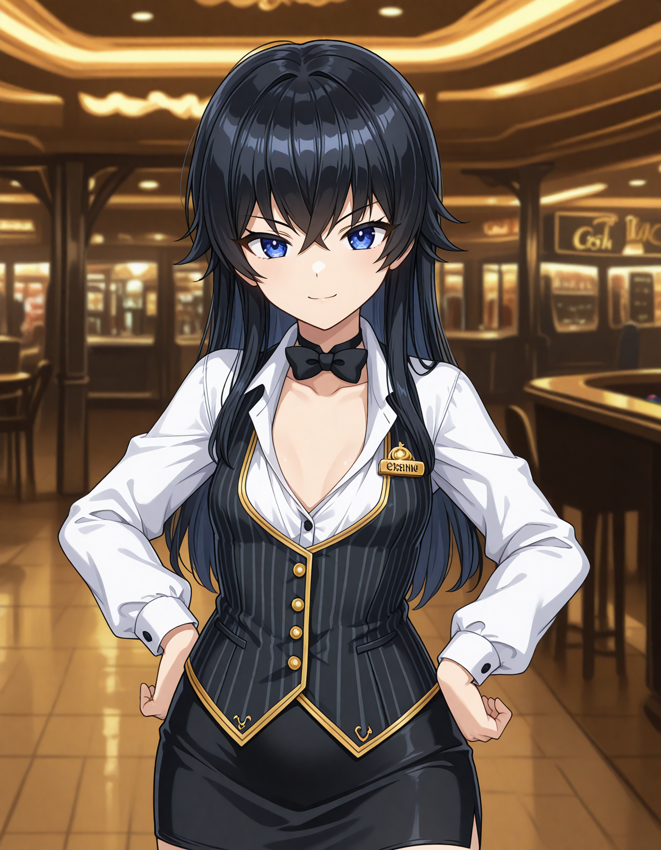 Otsuki_Croupier, black bowtie, white shirt, partially unbuttoned, collarbone, black vest, vertical-striped clothes, gold nameplate
