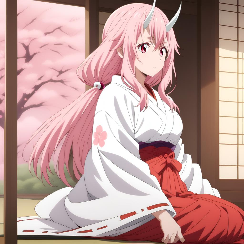 1girl,shuna, long hair, bangs, pink hair, horns, light pink eyes, oni horns, oni, hair bobbles,skirt, long sleeves, japanese clothes, wide sleeves, kimono, hakama, hakama skirt, white kimono, miko, red hakama,