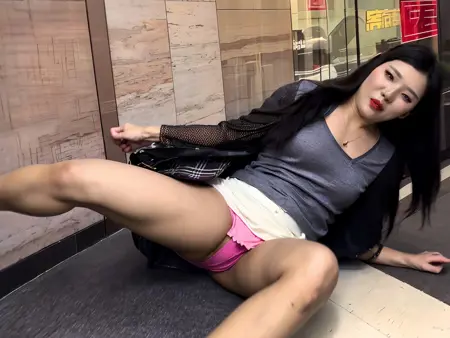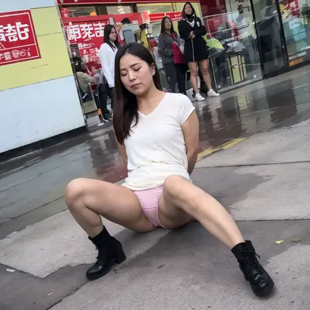 The core content is the scene of a woman sitting on the ground with her skirt exposed,